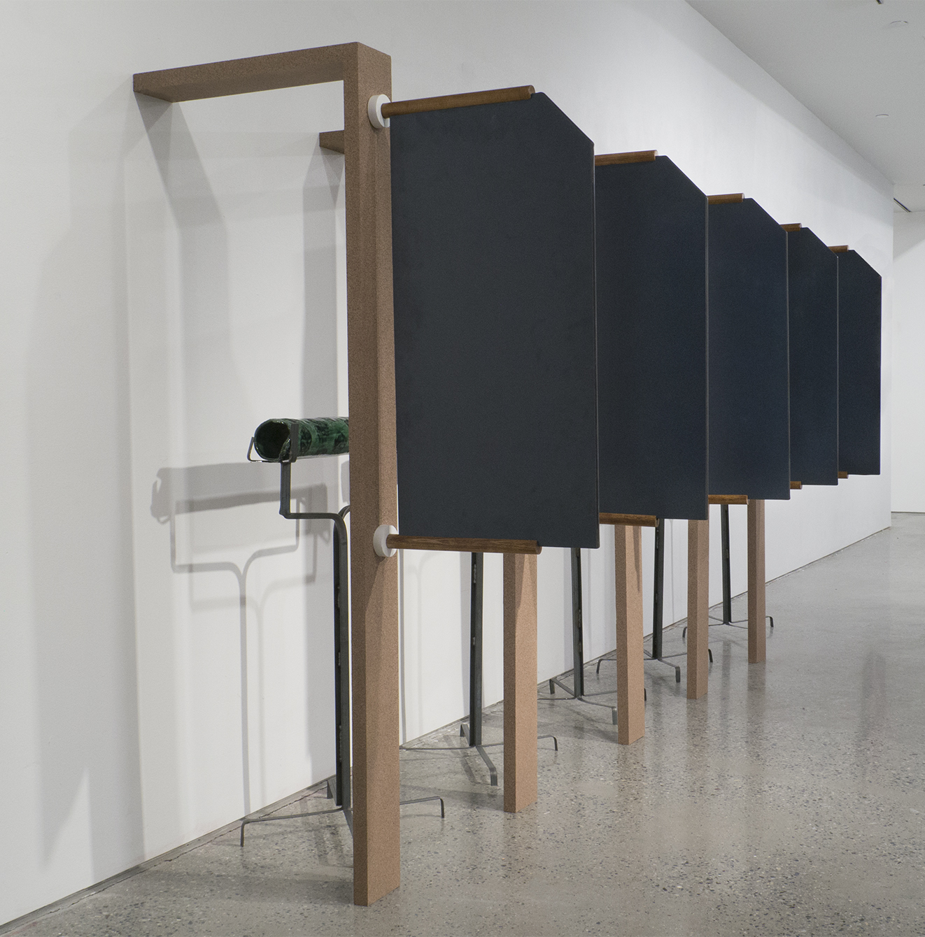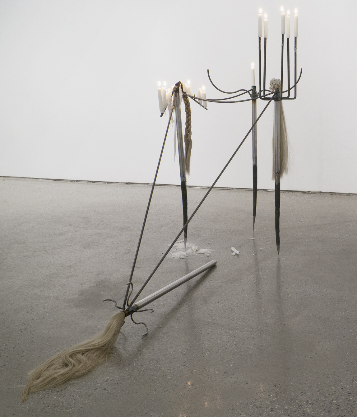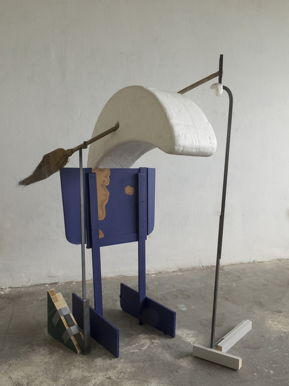 Wood, steel, styrofoam, mouldable plastic, broom, door jambs, tape, paint
