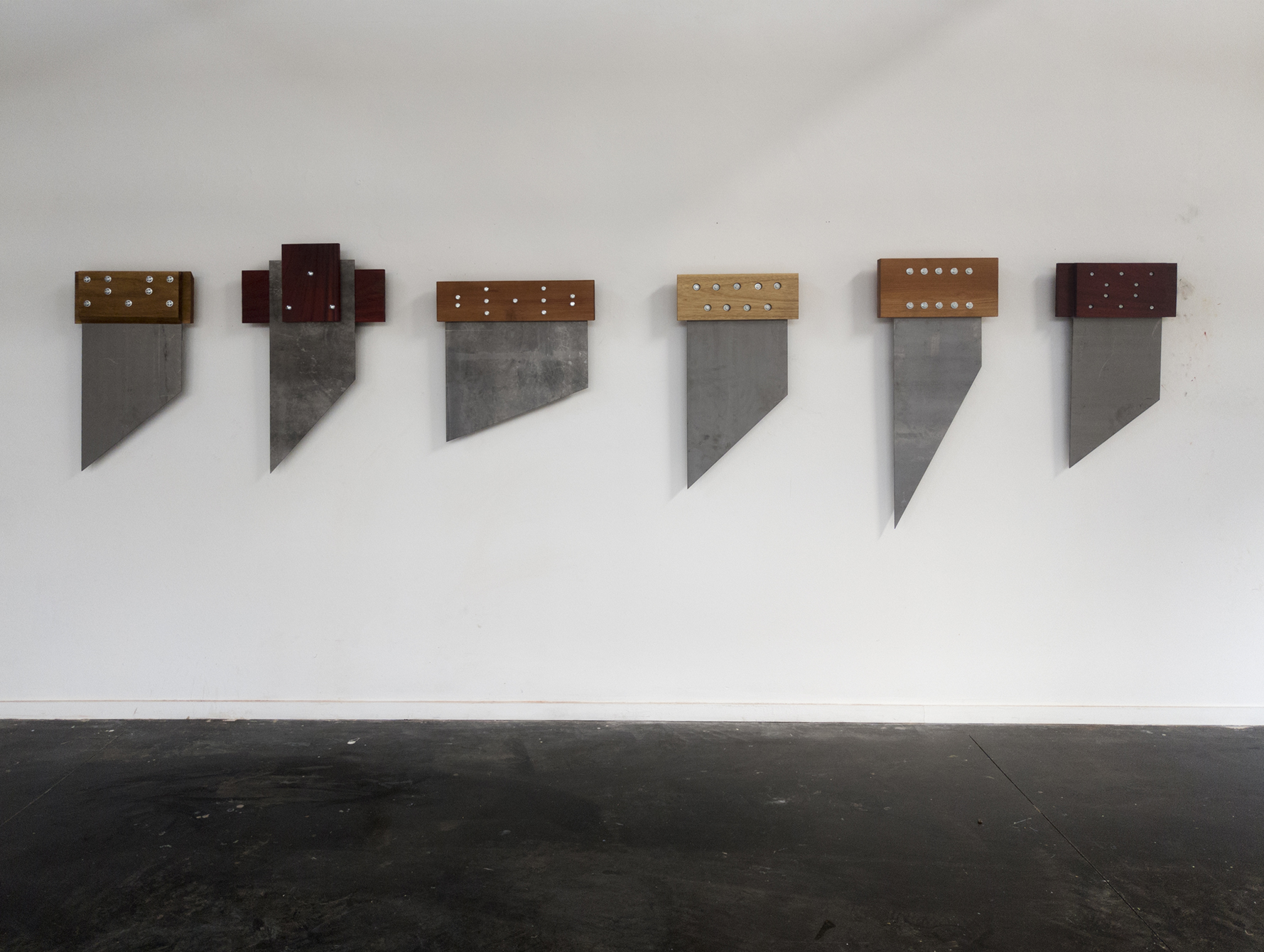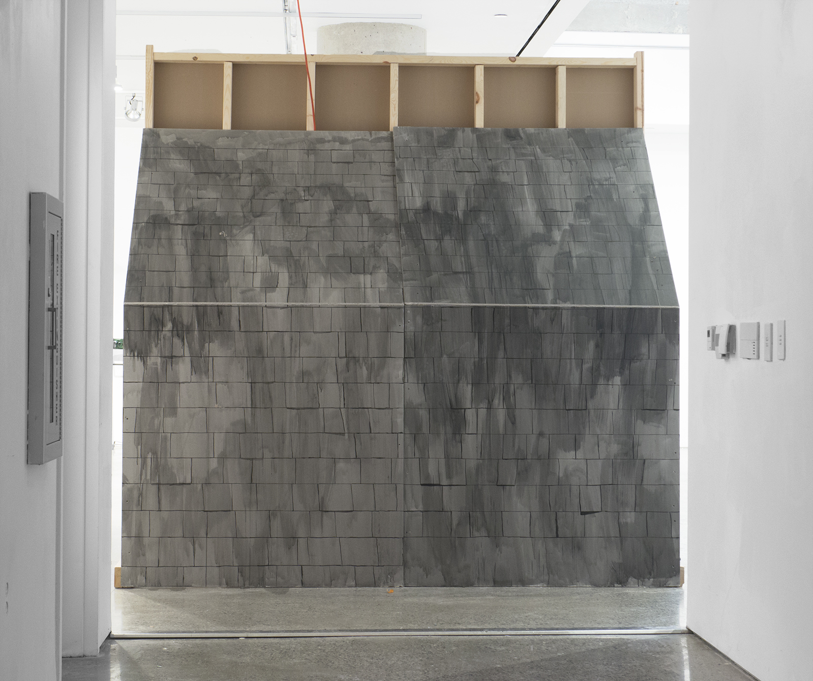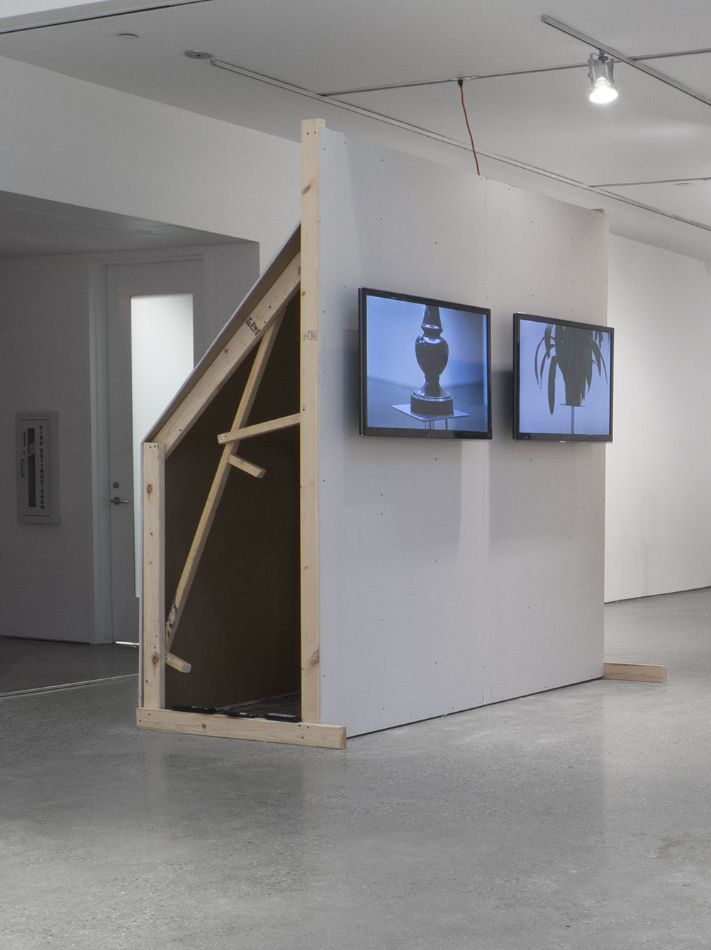 Wood, steel, styrofoam, mouldable plastic, broom, door jambs, tape, paint